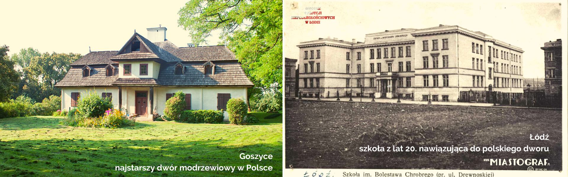 Zdjęcie po lewej: najstarszy dwór szlachecki w Polsce, wybudowany w XVII w.; źródło: www.polskiezabytki.pl. Zdjęcie po prawej: szkoła w stylu dworkowym przy ul. Drewnowskiej 88, Łódź; źródło: www.miastograf.pl